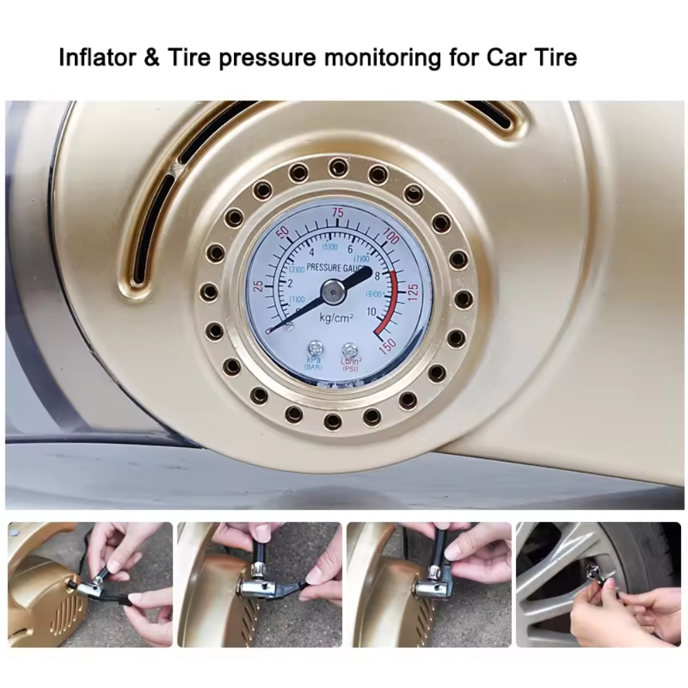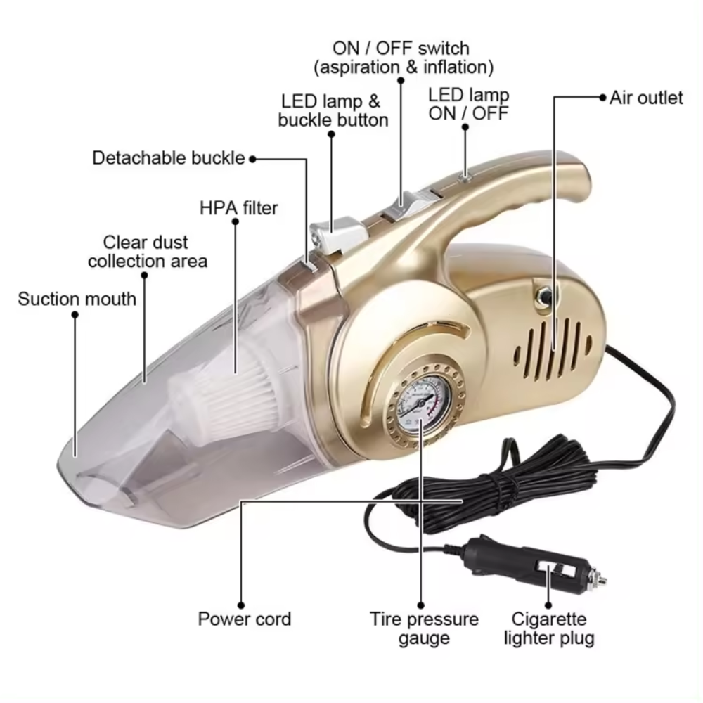 Múltiples funciones 4 en 1: Aspiradora potente para autos húmedos - secos 12V 100W. El inflador de neumáticos le ayuda a inflar los neumáticos en cualquier momento y en cualquier lugar. El indicador de presión de los neumáticos evita la sobreinflación. La luz LED ayuda a disipar la oscuridad.